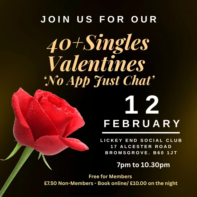A relaxed Valentine’s singles night in Bromsgrove. No speed dating, no pressure — just chat, mingle & enjoy a friendly evening.